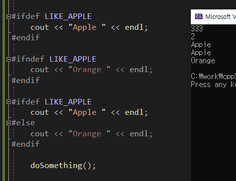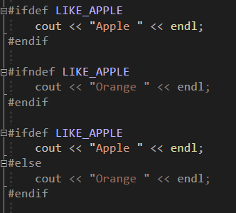 먼저 작성된 코드와 함께 붙여서 쓰면 되는 코드이다. #ifdef LIKE_APPLE는 LIKE_APPLE이 정의되어 있다면 #endif까지 동작하게 해주는 전처리기이다. #ifndef는 반대로 정의되어 있지 않은 경우에 동작하게 된다. 위처럼 ifdef와 ifndef로 분할해서 만들수도 있지만, ifdef와 else를 활용하여 작성할 수도 있다. 둘 다 똑같이 작동하게 될 것이다.