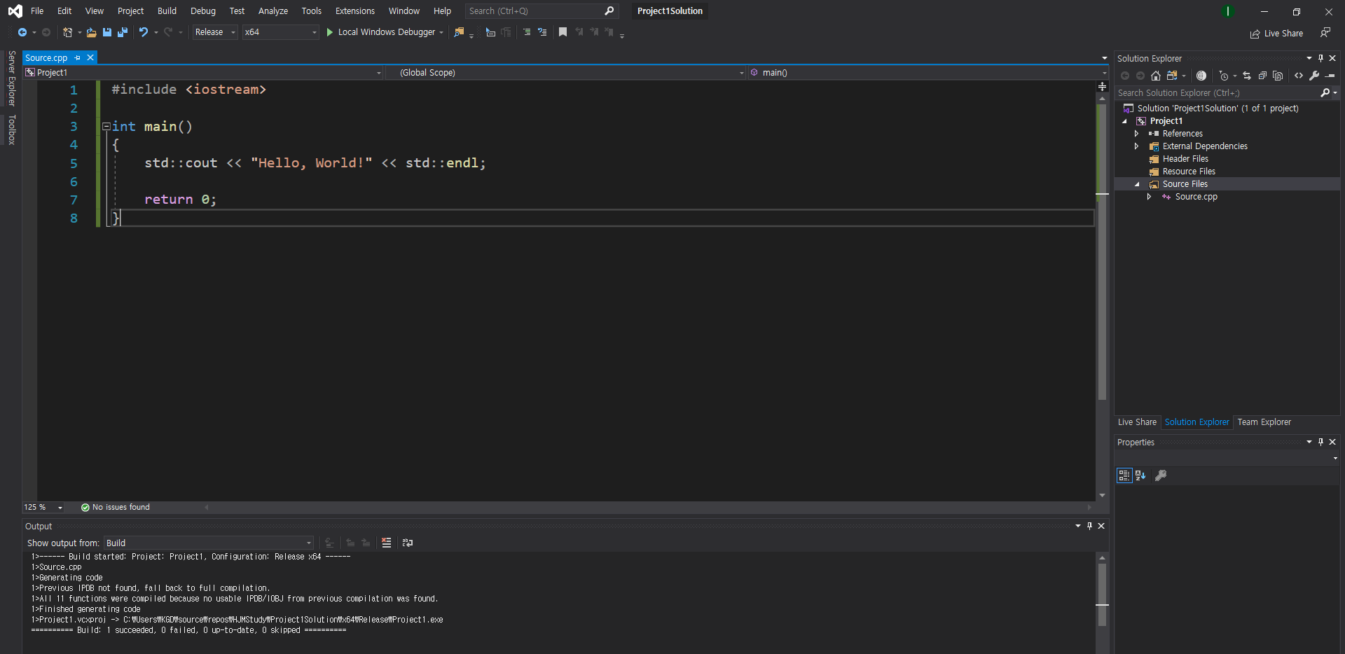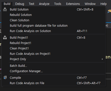 비주얼 스튜디오를 실행하면 최초에 솔루션을 하나 만들고 프로젝트 또한 만들어진다. 솔루션은 하나만 존재해야하지만 프로젝트는 하나의 솔루션에 여러개가 존재해도 된다. 각 프로젝트 파일엔 main 함수가 존재하게 되는데, 빌드를 할 경우에 내가 위치한 프로젝트가 빌드된다.