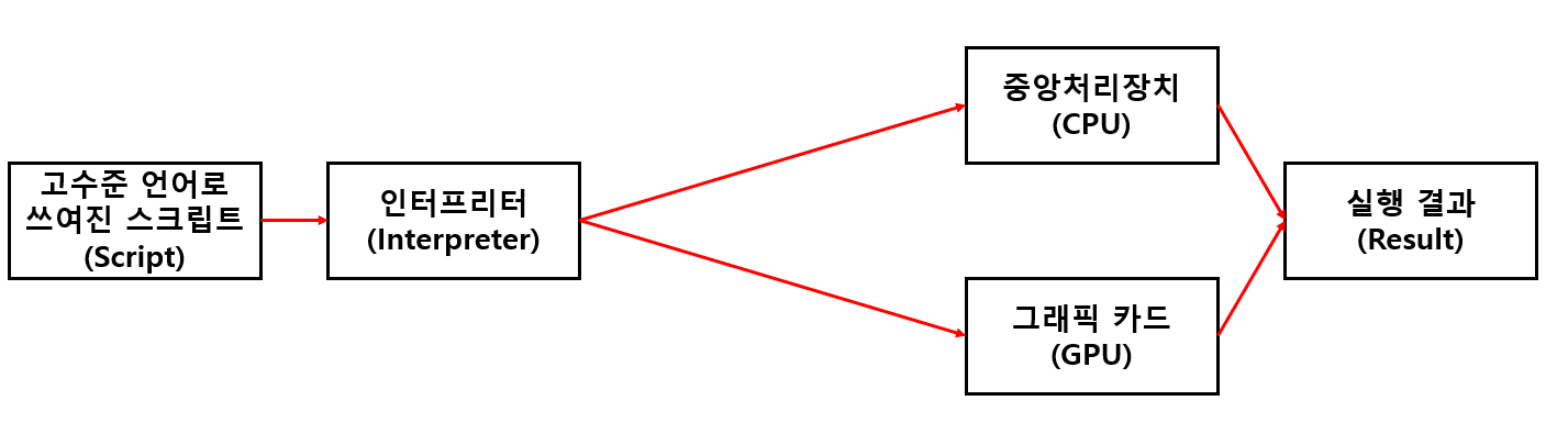 컴파일 언어와는 다른 언어로 대표적인 것이 인터프리터(Interpreter)이다. 인터프리터는 간단하지만 컴파일 언어보다 더 느리기 때문에 양날의 검이다. 실행 파일을 만드는 경우는 한번 만들고 여러 번 쓸 수 있다. 하지만 인터프리터 언어는 매번 인터프리터를 거쳐야 하므로 느리다. 파이썬 언어가 대표적이다. 인터프리터 또한 프로그램이다.