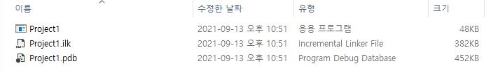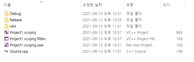 vcxproj는 프로젝트 정보를 담고 있다. Source.cpp는 작성한 코드 자체 파일이다. Debug나 Release 파일이 만들어져 있을텐데 내부에 들어가면 오브젝트(obj) 파일이 만들어져 있을 것이다.