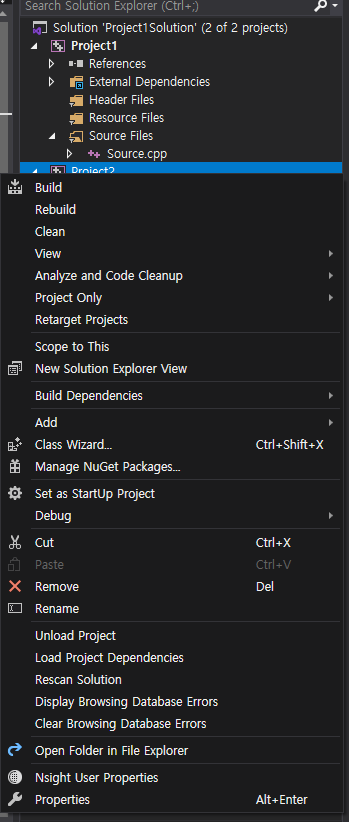 현재는 Project1이 볼드체로 되어 있기 때문에 빌드를 할 경우 Project1이 빌드된다. Project2로 넘어가고 싶다면 오른 클릭 후 Set as StartUp Project를 클릭하면 Project2로 넘어간다. 그 뒤 빌드하면 Project2에 대한 실행 파일이 생긴다. 프로젝트를 지우고 싶다면 Remove를 사용하여 연결을 끊고 파일 자체를 지우자!