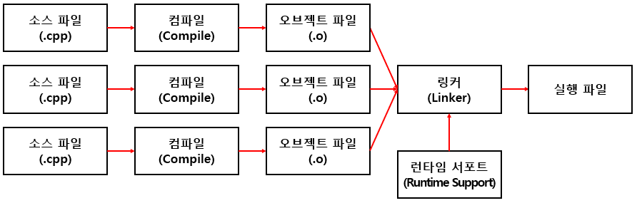 런타임 서포트(Runtime Support)는 다른 곳에서 지원해주는 파일로 기억하면 되겠다. 각각의 소스 파일은 컴파일을 통해 오브젝트 파일로 변하고 링킹을 통해 실행 파일을 생성하게 된다.