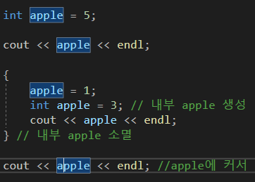 이번에는 내부 블럭을 하나 더 생성한 뒤에 apple이라는 지역 변수를 하나 더 생성해주었다. 이 경우 apple이 두 개가 존재하는데, 가장 가까운 범위에서 정의된 apple을 사용하게 된다. 이러한 말이 어려울 수 있는데, 요즘 visual studio는 이 부분에 대해 서포트를 해준다.