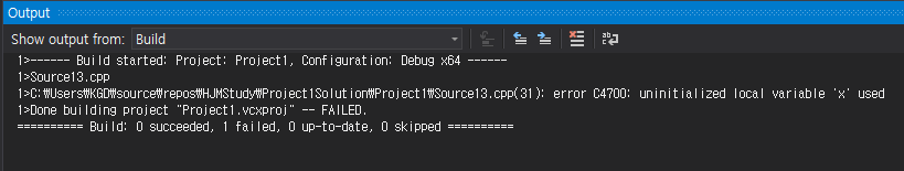 debug 모드에서는 앞에서 소개한 코드를 빌드할 경우 위와 같이 x가 초기화되지 않았다는 경고 메시지가 뜬다. 무시하고서 프로그램을 실행시 runtime error가 뜬다.