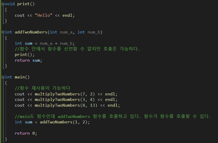 cout << multiplyTwoNumbers(8, 13) << endl;//함수 재사용이 가능하다