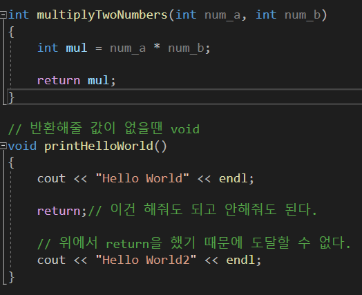 반환값이반환 값이 있느냐에 따라서 함수의 표현이 달라진다. multiplyTwoNumbers의 경우 int 자료형을 반환해주기 때문에 함수명 앞에 int가 붙어 있고 printHelloWorld의 경우엔 반환 값이 없기 때문에 void를 사용하였다.