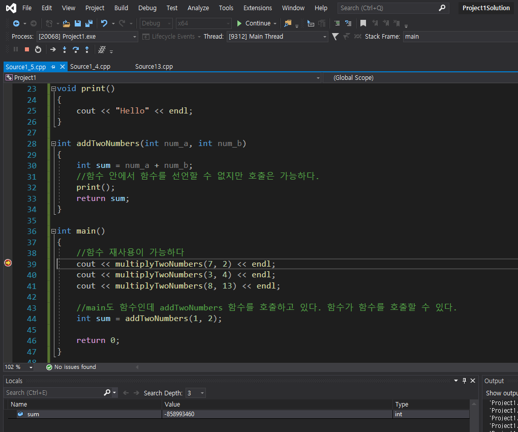 디버깅을 시작하고서 아래 Locals 파트를 보자. sum이라는 변수가 아직 값이 제대로 저장되어 있지 않아서 의미 없는 쓰레기 값이 저장된 것을 볼 수가 있다. F11을 눌러서 함수 내부 동작을 들여다보자.