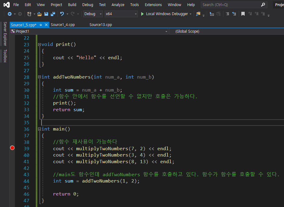 visual studio 상단에 debug 모드로 실행한 뒤에 함수 호출 부분에 디버깅을 위한 표식을 남기자. 코드 줄 숫자 표시 옆 회색 부분을 클릭하면 위의 사진처럼 디버깅을 위한 점이 생긴다. 그리고 F5를 클릭하여 디버깅을 시작해보자.