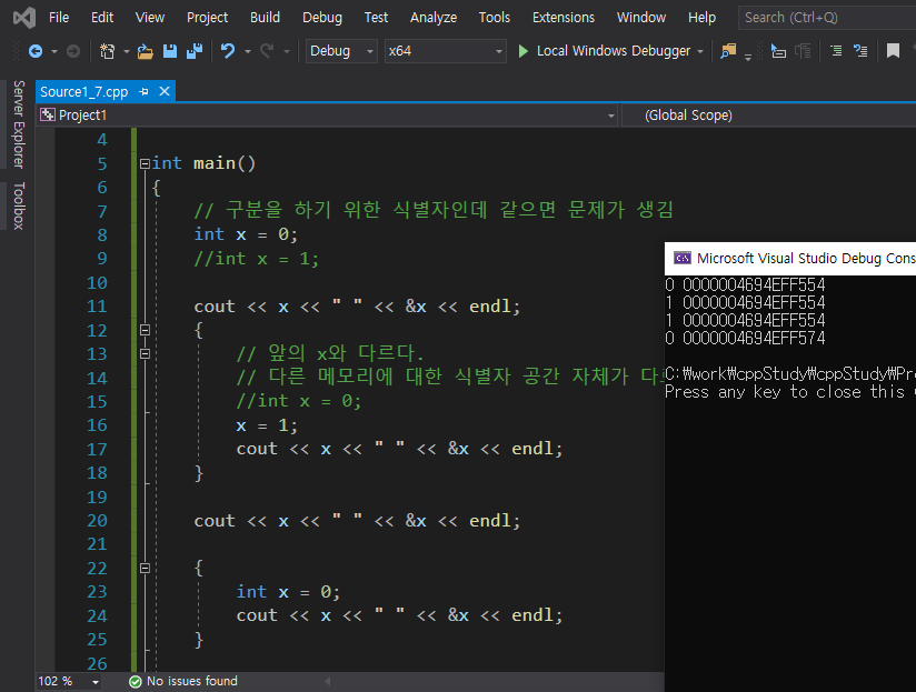 첫 중괄호에서 새로운 지역 변수 x를 할당하는 것이 아닌 x를 1로 만들고서 메모리 주소를 출력하기만 했다. 메모리 주소는 변하지 않았고 기존의 x의 값만 바꾼 것을 알 수가 있다.