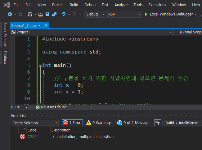 같은 중괄호에 같은 식별자의 변수는 존재할 수 없다. 애초에 식별자가 식별을 위해 존재하는 것이기 때문에 다른 메모리에 같은 식별자로 두는 것은 허용되지 않는다.