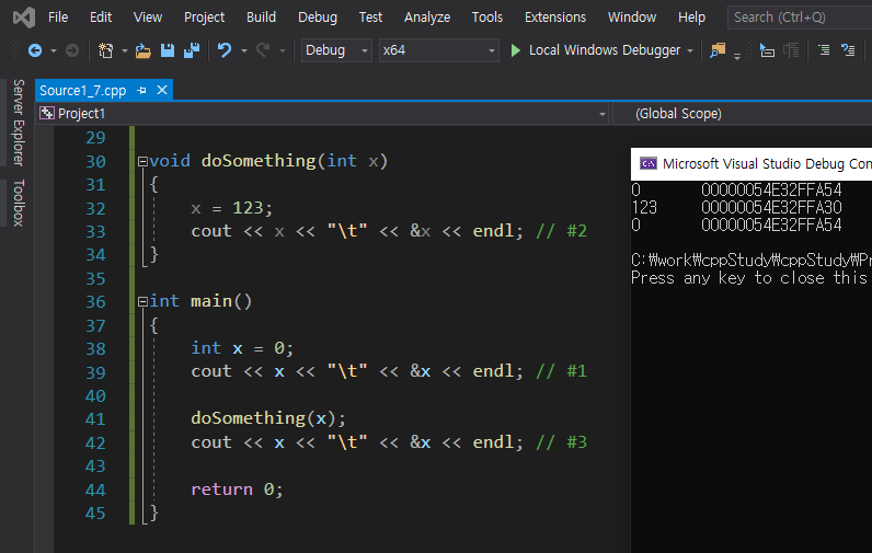 main 함수에서 생성한 x를 인자로 사용하는 doSometing 함수이다. 인자의 주소는 끝이 A54이지만 doSomething 함수에서 사용한 x의 메모리 주소는 A30으로 끝난다. 이를 통해 인자의 메모리 주소와 매개변수의 메모리 주소는 다르다는 것을 알 수 있다. 그렇기 때문에 x의 값을 123으로 변경했어도 main 함수에서 할당한 x의 값은 변하지 않음을 알 수 있다.