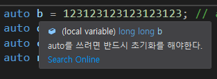 이렇게 auto로 초기화한 변수에 마우스 커서를 올리면 어떤 자료형으로 추론이 되었는지 알 수 있다.